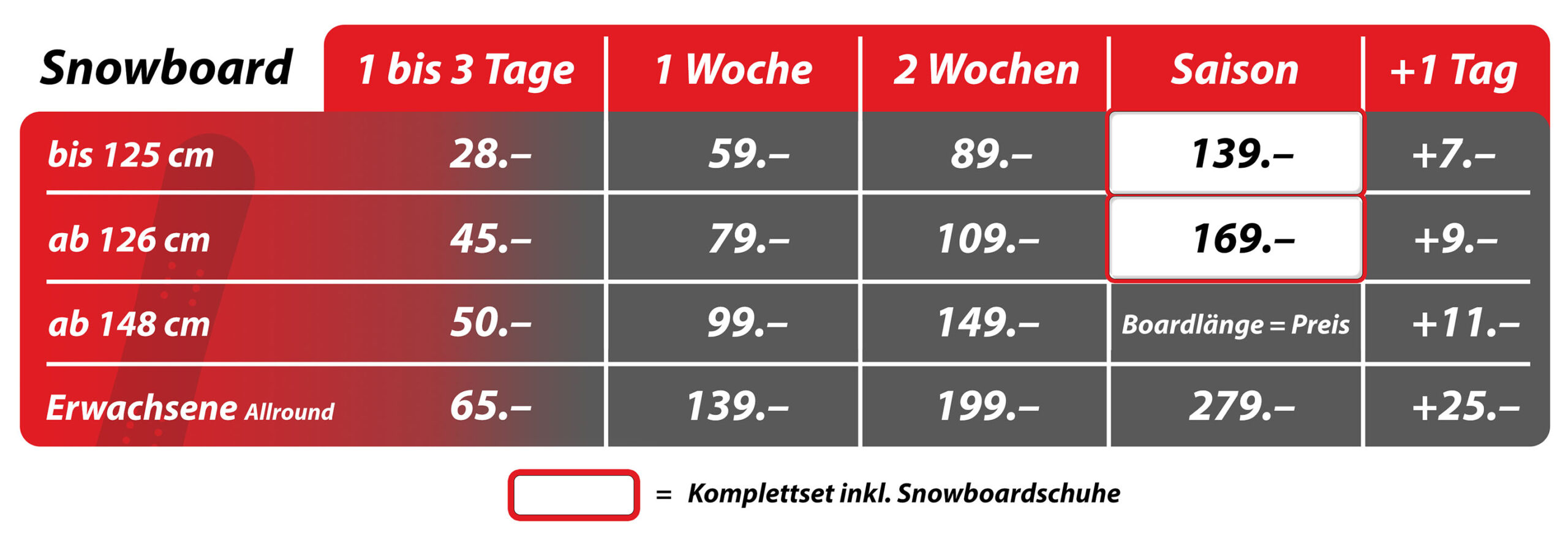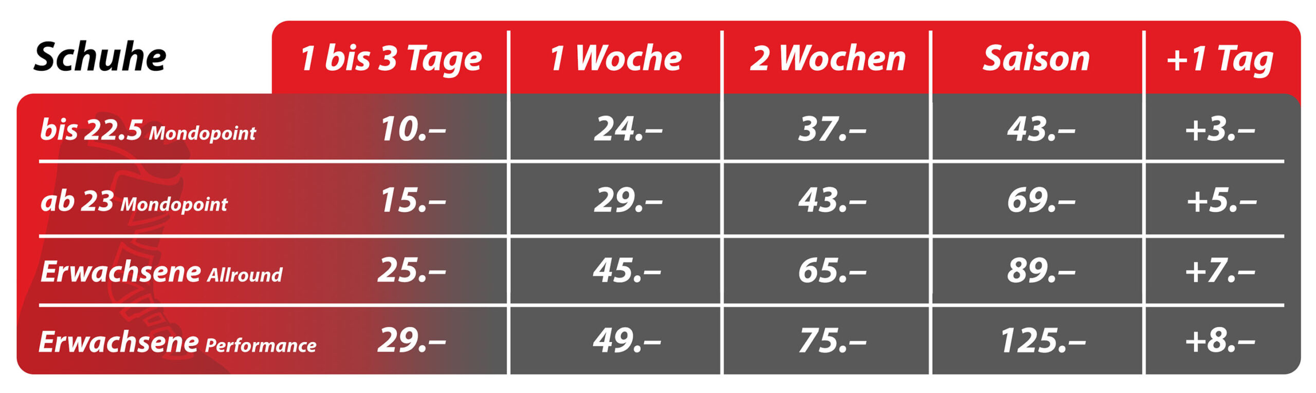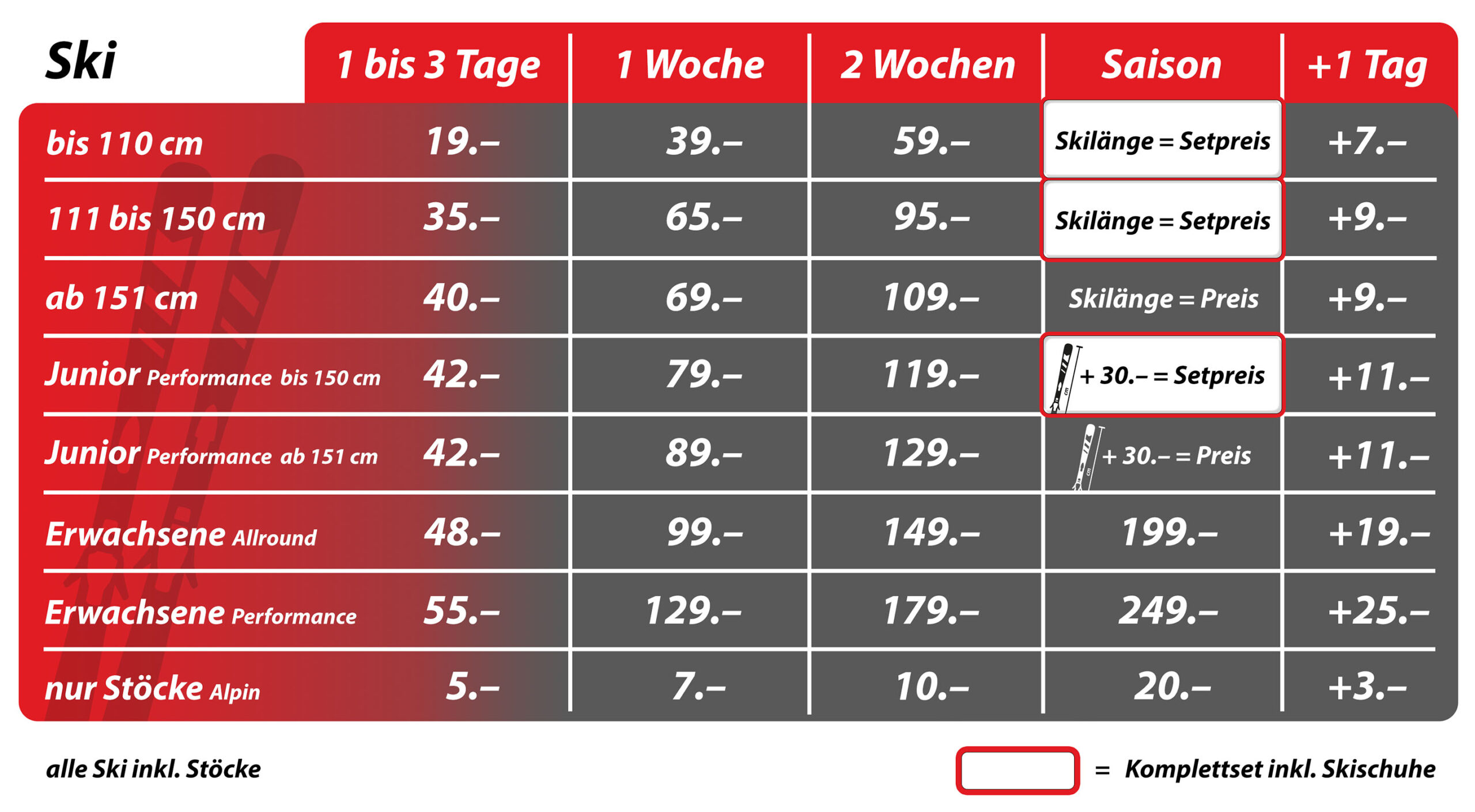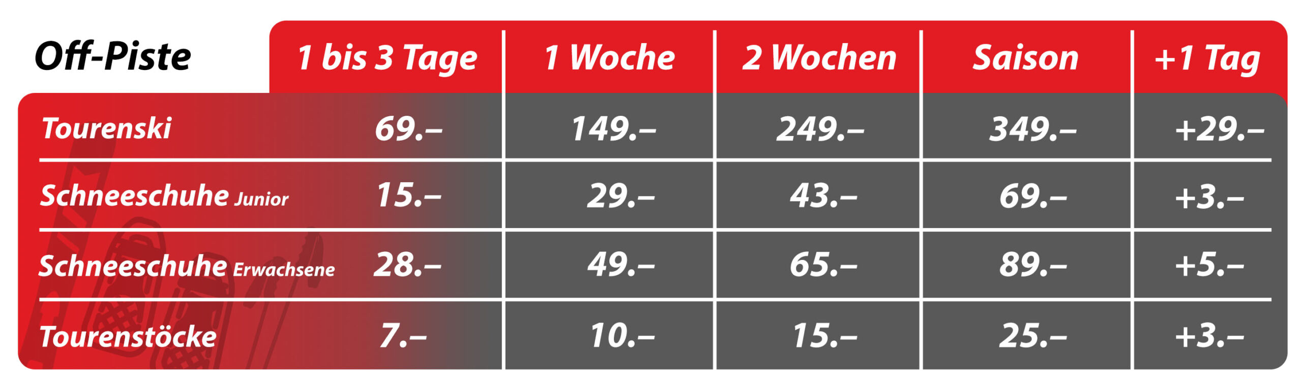 Wir empfehlen die Nutzung unserer sehr attraktiven Saisonmiete, so können Sie flexibel den ganzen Winter geniessen und erhalten das beste Preis-Leistungs-Verhältnis.Grundsätzlich gilt der letzte Öffnungstag im April als spätestes Rückgabedatum bei der Saisonmiete.